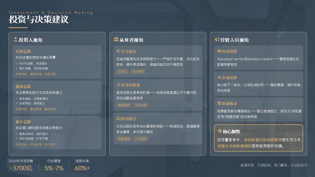 生存优先:现金流管理与成本控制能力——严控扩张节奏、优化成本结构、提升单店盈利、储备现金应对不确定性。差异化聚焦:避免同质化竞争的红海——在特定维度建立不可替代性,而非试图全面竞争。组织能力:从创业团队到专业化管理的转型——制度驱动、数据管理、专业管理、多元能力建设。