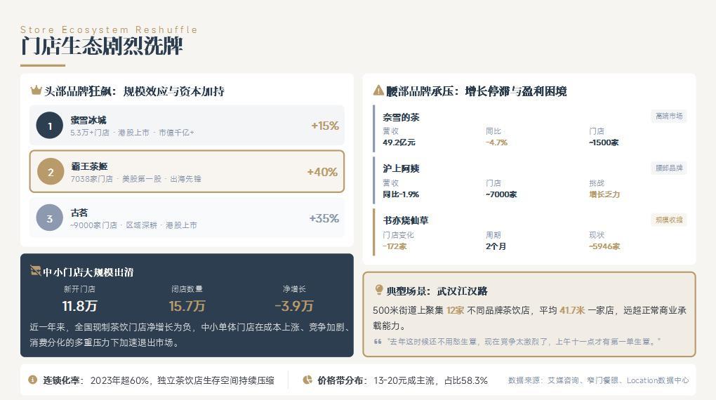 2024-2025年的门店洗牌,不仅是周期性调整,更是结构性出清。近一年来,全国现制茶饮门店新开11.8万家,闭店数量高达15.7万家,净增长为-3.9万家。这一数据揭示了行业生态的剧烈重构——中小单体门店在成本上涨、竞争加剧、消费分化的多重压力下,正加速退出市场。