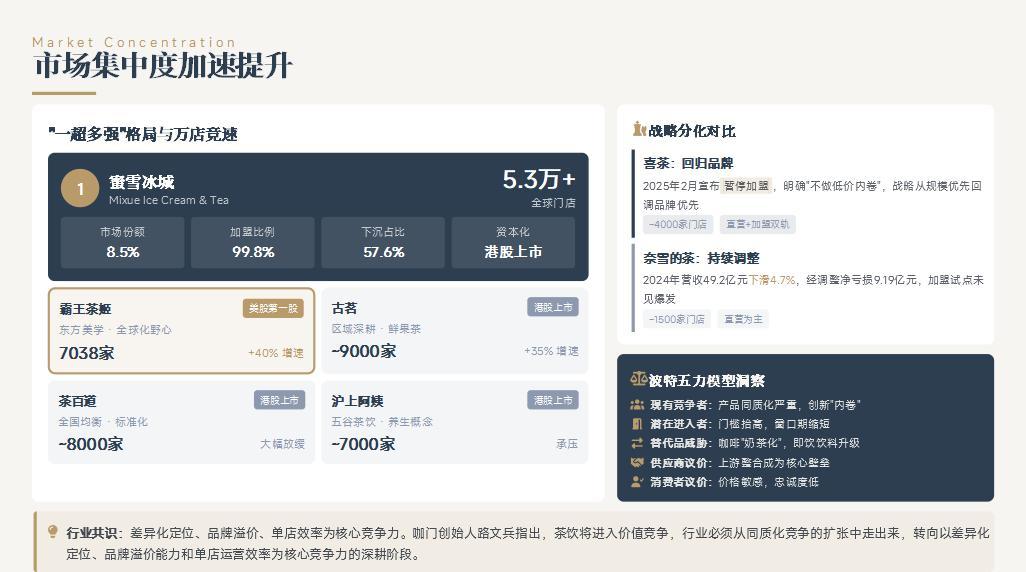 行业呈现出“一超多强,腰部崛起”的态势。截至2025年上半年,蜜雪冰城全球门店已突破5.3万家,霸王茶姬门店激增至7038家,同比增长超40%。