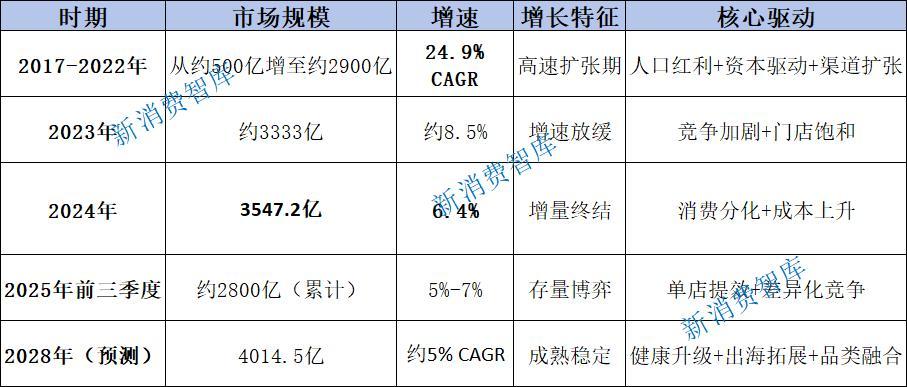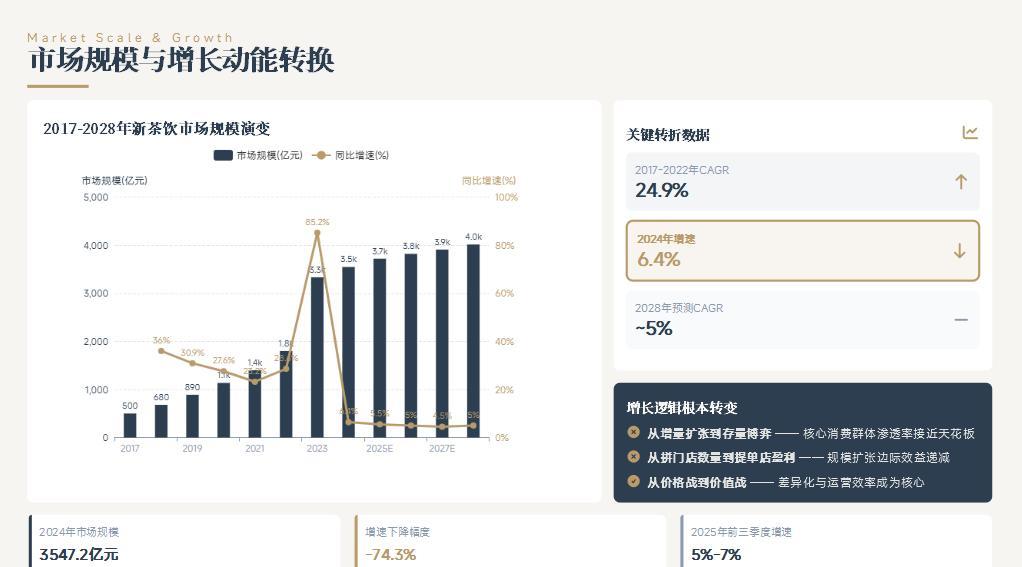 2025年,中国新茶饮行业正式告别“跑马圈地”的高速增长期,进入“规模见顶、精耕细作”的转型期。数据显示,2024年市场规模3547亿元,增长率仅6.4%,远低于2017-2022年间24.9%的复合增长率。