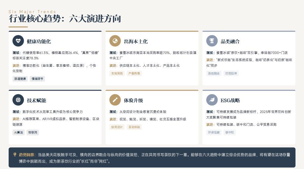当品类天花板触手可及,横向的边界融合与纵向的价值深挖,正在共同书写茶饮的下一章。而那些能够在健康功能化、出海本土化、品类融合、技术赋能、体验升级、ESG战略六大趋势中建立综合优势的品牌,将有望在这场存量博弈中脱颖而出,成为新茶饮行业的"长红"而非"网红"。