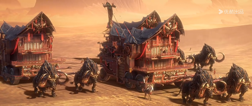 比如巍峨的夏都、肃穆的桐宫,跟烟火气十足的寿华城形成鲜明对比;在瀛台中窥见中国古建筑的影子,透过有穷商队的铜车感受器物文化的魅力;朝歌城的登基大典一幕,则是对商朝玄鸟礼制的最好体现。