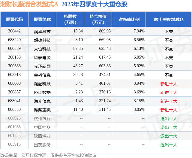 湘财长顺混合发起式A的前十大重仓股如下: