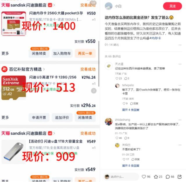 记者在社交平台检索发现,相关话题引发网友热议:“闪迪价格这么离谱了吗”“相机内存卡涨价太猛了吧,想买一个32g的,昨天加购时价格还是55,今天就成了77”“为什么最近内存卡价格翻一倍啊???”……