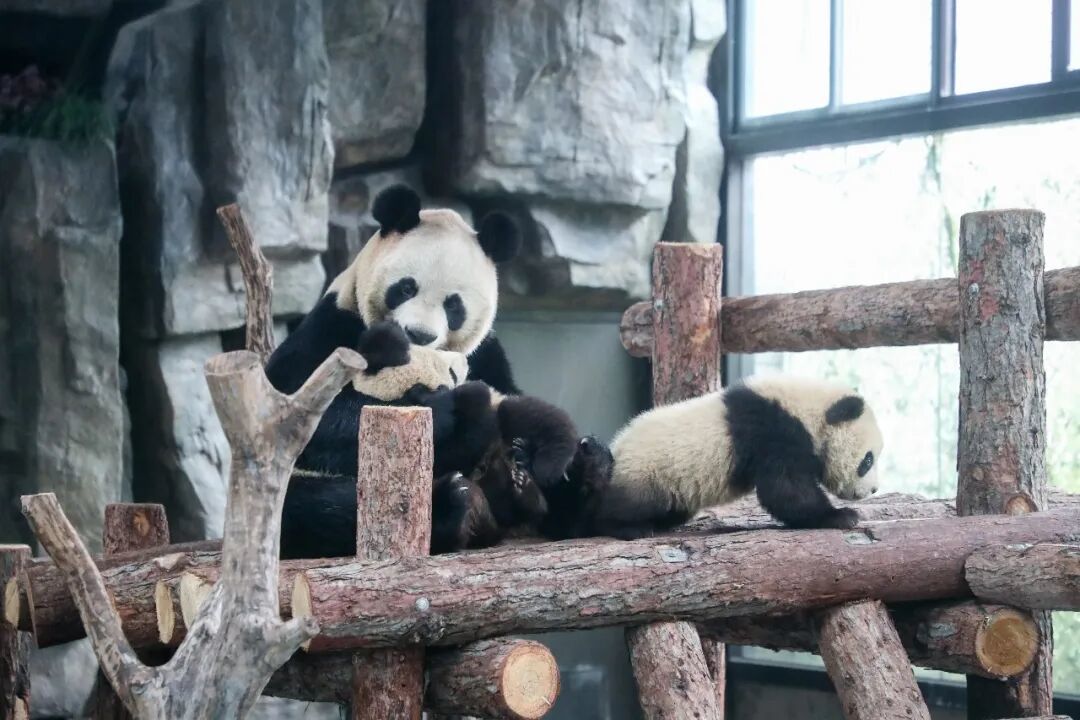 保育员介绍,当初“芊金”顺利诞下龙凤胎后,考虑到同时哺育双崽的风险,团队第一时间启动专项照料方案,采用“母带幼为主、人工辅助为辅”的科学模式,24小时轮班值守,实时监测“芊金”和姐弟俩的身体状态,定制营养强化配方奶,精准补充营养,全方位守护母子三人。
