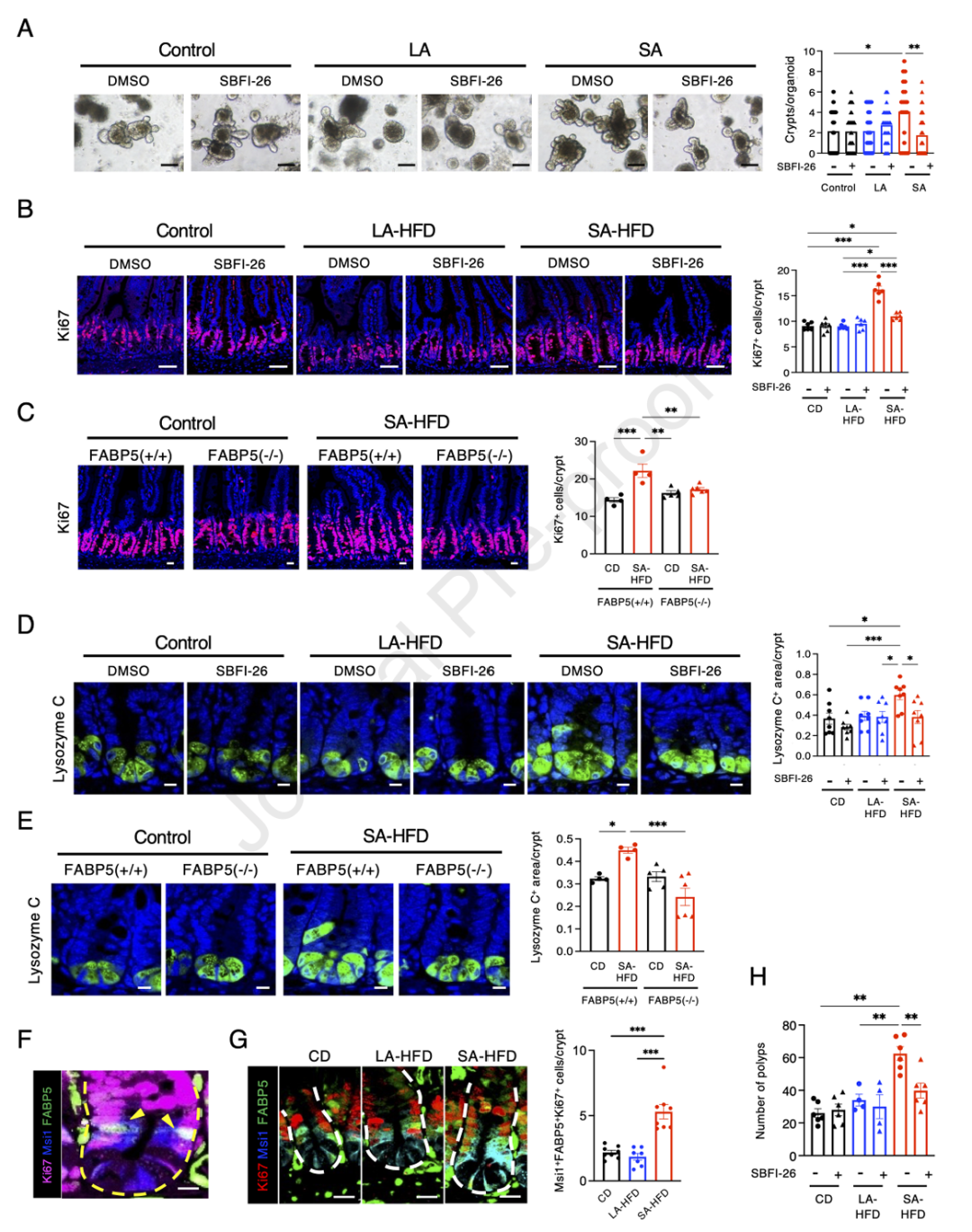 图4:抑制脂肪酸结合蛋白5可减弱富含硬脂酸的高脂饮食诱导的肠上皮增殖、潘氏细胞分化及肿瘤发生