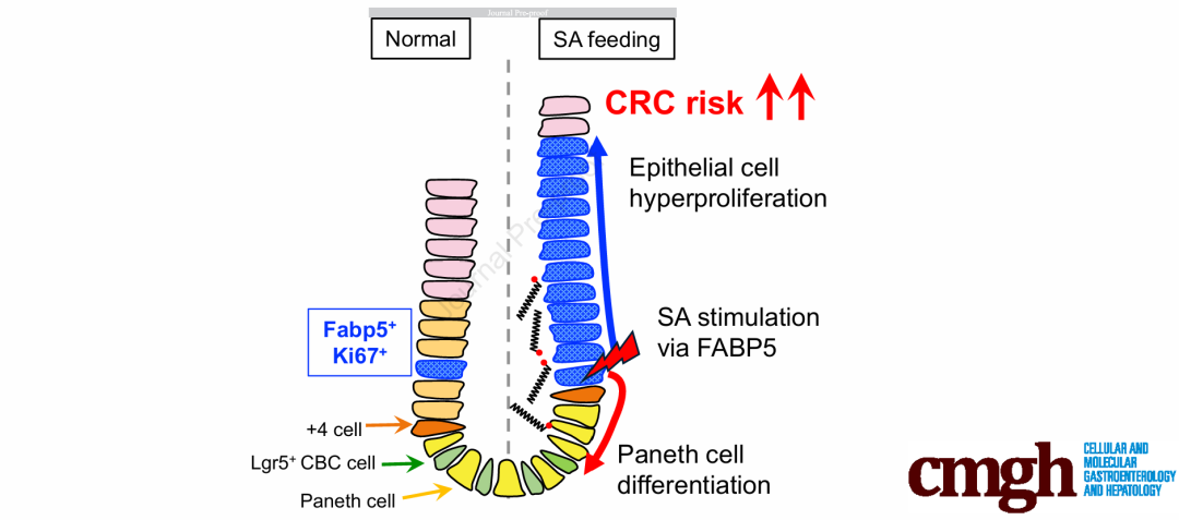 研究团队将目光聚焦于脂肪酸结合蛋白家族,发现脂肪酸结合蛋白5具有特殊表达模式:它特异性表达于肠道隐窝中少量Ki67+增殖细胞。富含硬脂酸的高脂饮食会显著增加隐窝中Ki67+脂肪酸结合蛋白5+双阳性细胞的数量,而在人结直肠癌组织中,脂肪酸结合蛋白5的表达水平也显著高于正常组织,提示其与肠道肿瘤发生密切相关。