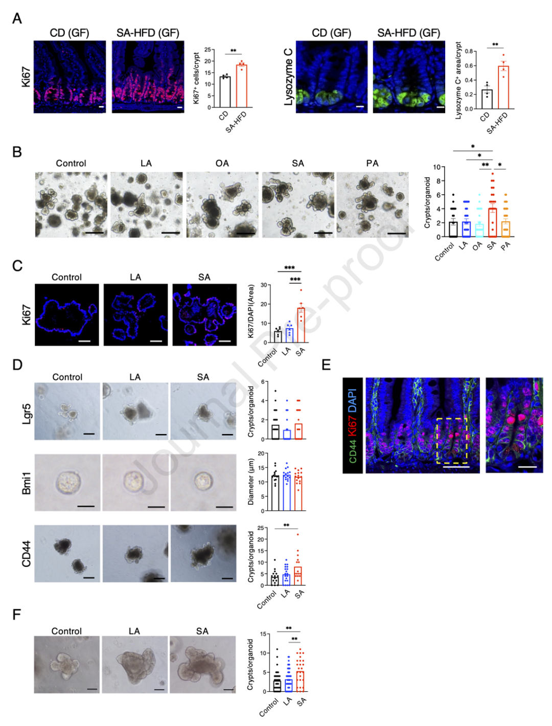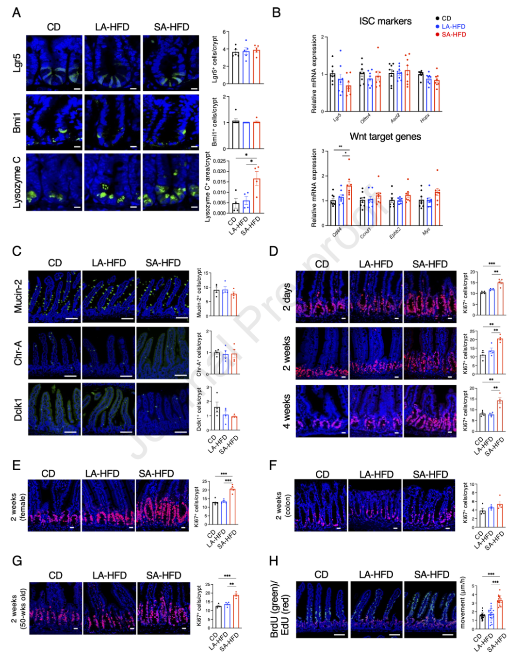 图2:富含硬脂酸的高脂饮食促进潘氏细胞分化及肠上皮细胞的增殖与更新