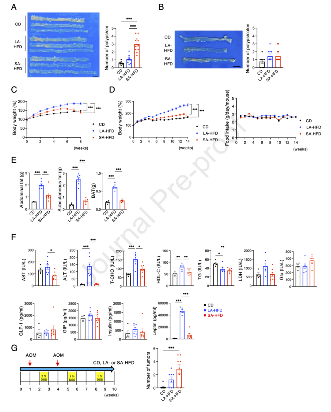 图1:富含硬脂酸的高脂饮食促进小鼠模型的肠道肿瘤发生,但不引发肥胖及相关代谢异常