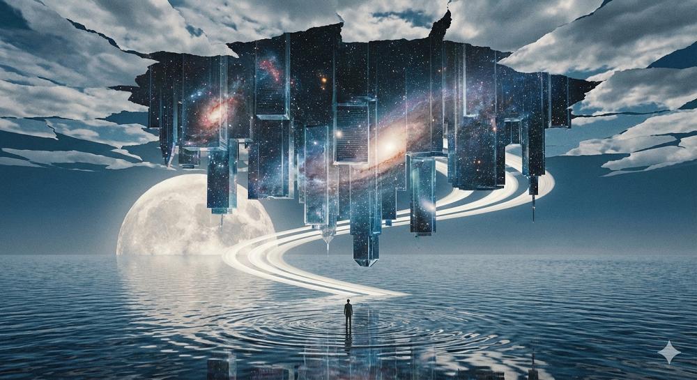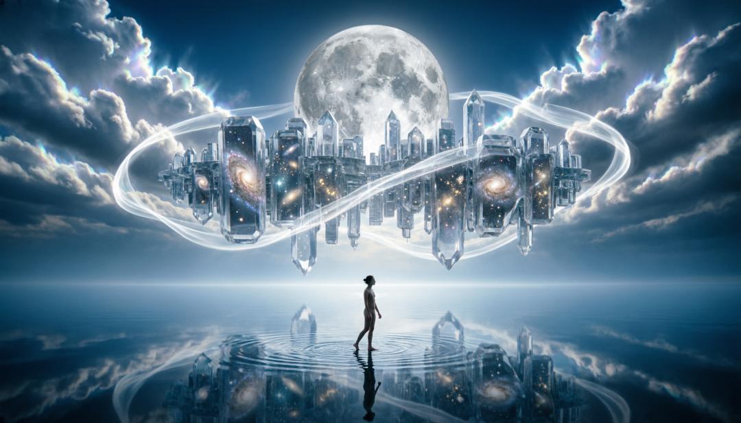 无边无际的海面上漂浮着一座倒置的城市,城市建筑如水晶般透明,内部流动着星空与光点。天空呈现撕裂般的云层结构,巨大的月亮贴近海平面,月光化为实体的光带缠绕在城市周围。一名渺小的人站在水面之上,脚下泛起涟漪,现实与梦境在此交汇,画面安静而震撼。