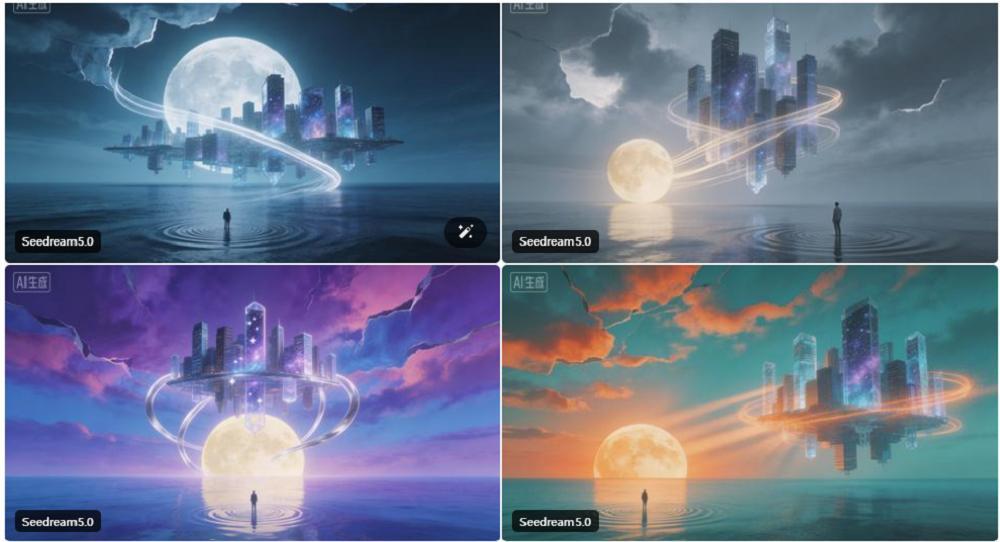 Seedream5.0 Preview提供了四个版本,可以看到它并没有遵循我们提示词中“像水晶般透明”的要求,不过其余内容基本得到了还原。其画风更为科幻感一些。