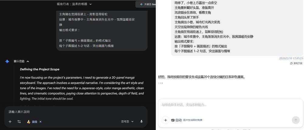 而在多子图生成任务上,我们让上述三款模型生成一副具有20个分镜的漫画,提示词依旧较长。