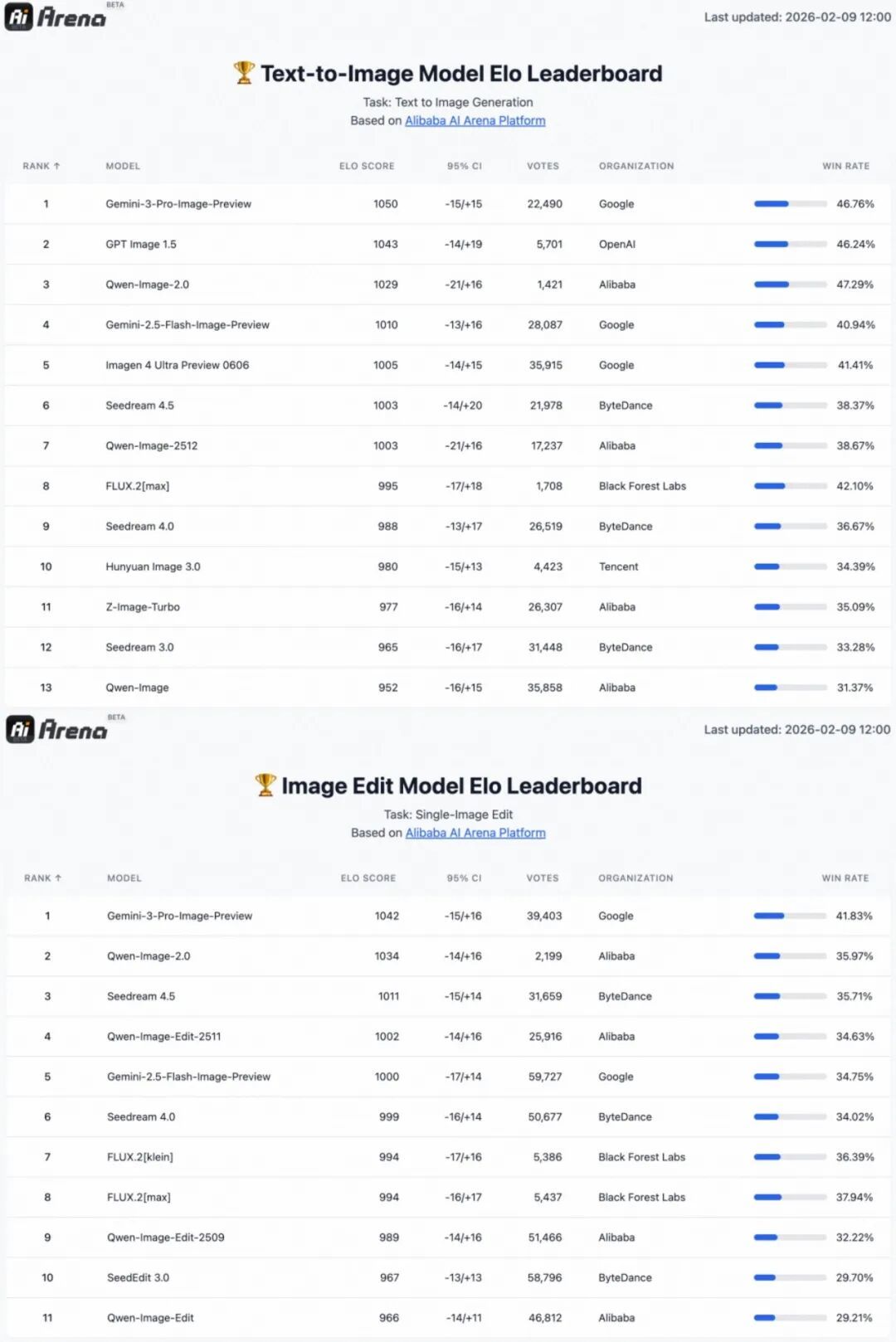 阿里在AI盲测平台AI Arena上对Qwen-Image 2.0进行了测试,数据显示,Qwen-Image 2.0在文生图和图生图基准中分别排名第三和第二,不过距离谷歌的Nano Banana Pro(图中为Gemini-3-Pro-Image-Preview)还有一定差距。此外,这一模型暂时还没有和刚发布的Seedream 5.0 Preview进行对比。