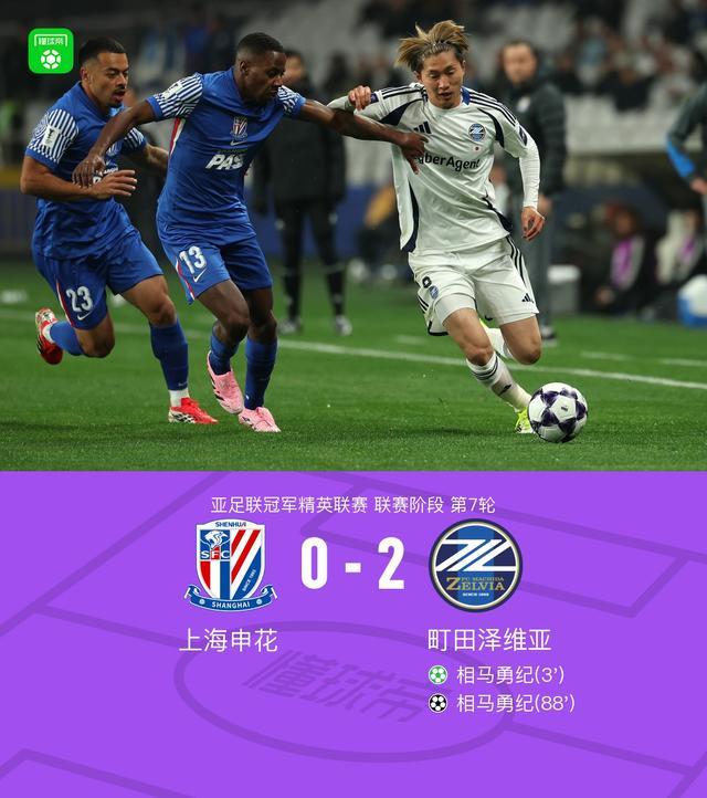 北京时间2月10日亚足联冠军精英联赛 联赛阶段 第7轮,上海申花对阵町田泽维亚。上半场金顺凯开场23秒送点,相马勇纪点射破门。下半场尾声相马勇纪梅开二度。最终申花0-2不敌町田泽维亚提前一轮出局,客队提前一轮晋级。