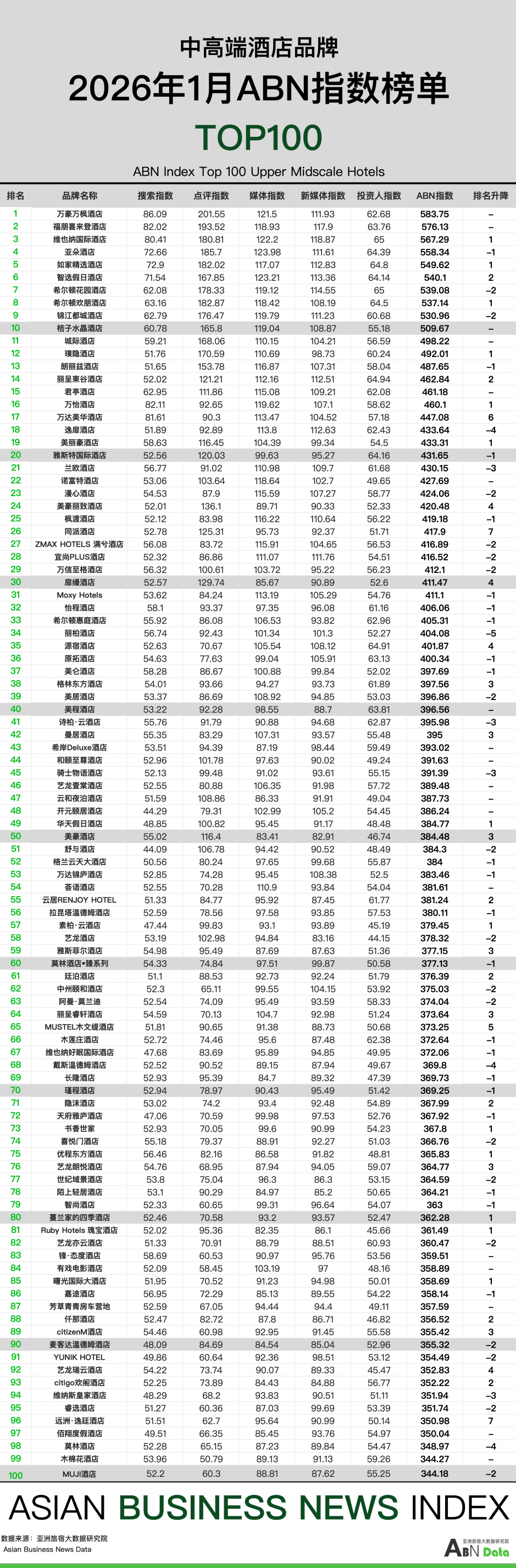 综述:2026年1月,中高端酒店的五大指数均处于高位,五个指数监测综合平均得分达到了404.84。