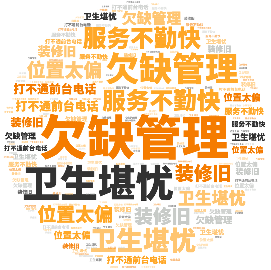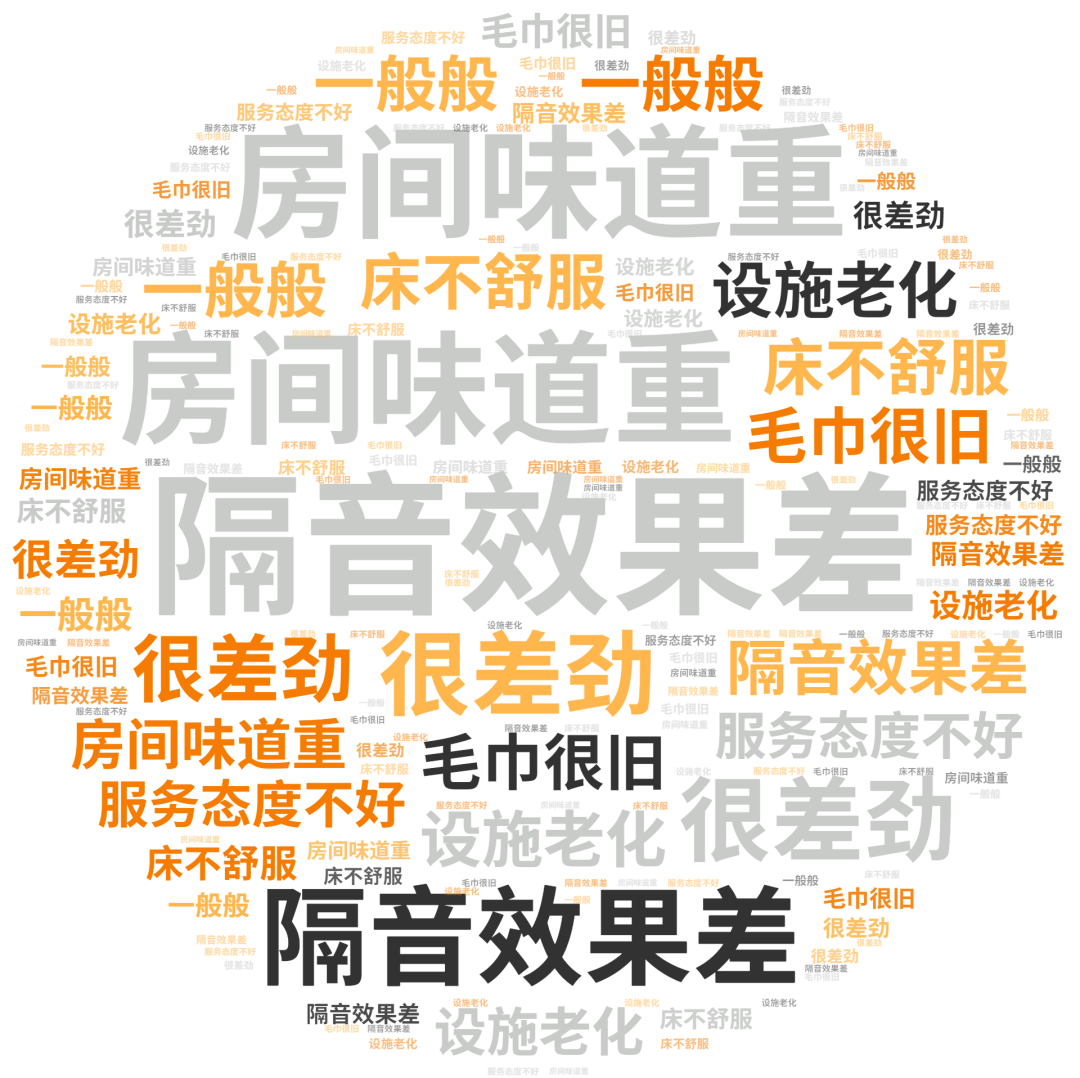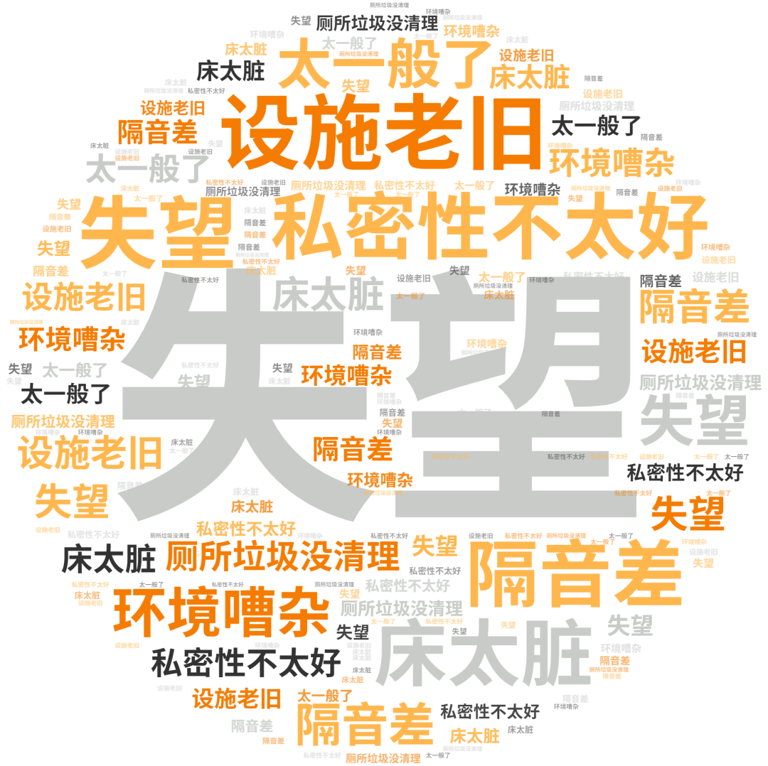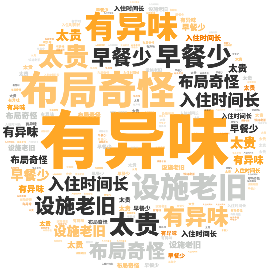 点评指数:经济型酒店点评指数平均得分达83.13分,整体有大幅提升,但未有300分品牌出现,好评维度平均是差评维度的1.33倍。好评关键词主要是经济型酒店的性价比高、早餐不错、入住快等方面。差评关键词主要集中房间小、不隔音、有蚊虫等方面。