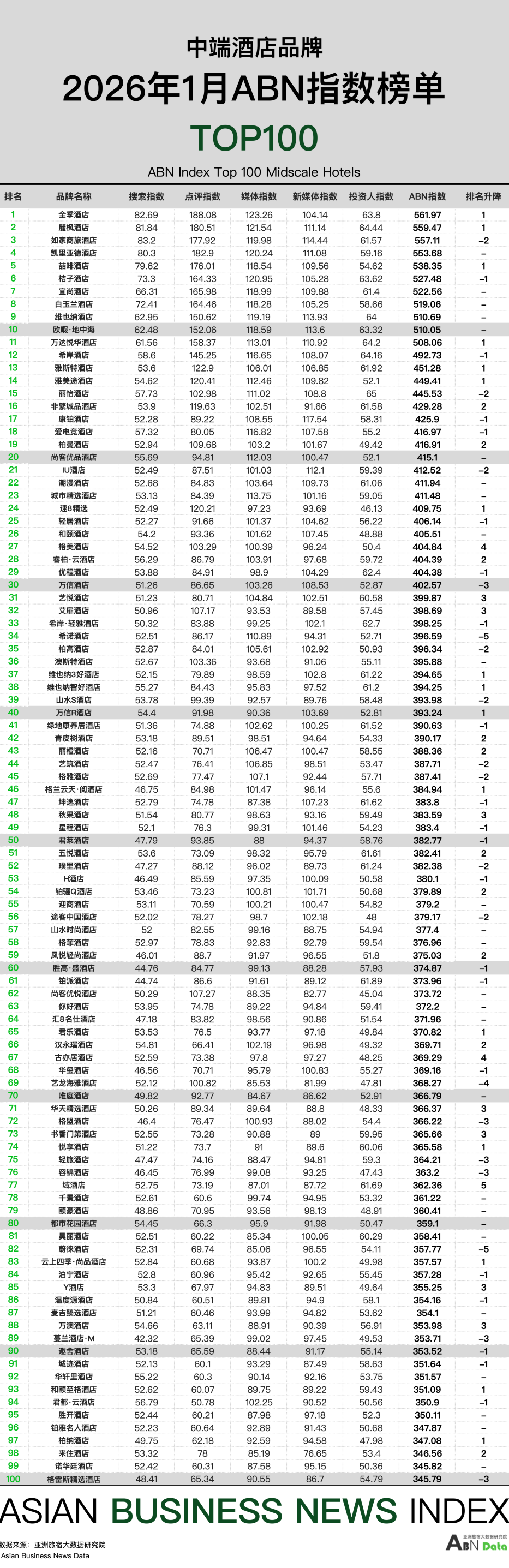 投资人指数:1月,全季品牌实现20店齐开,在2026年开年继续领跑中端市场,投资人指数小幅提升。