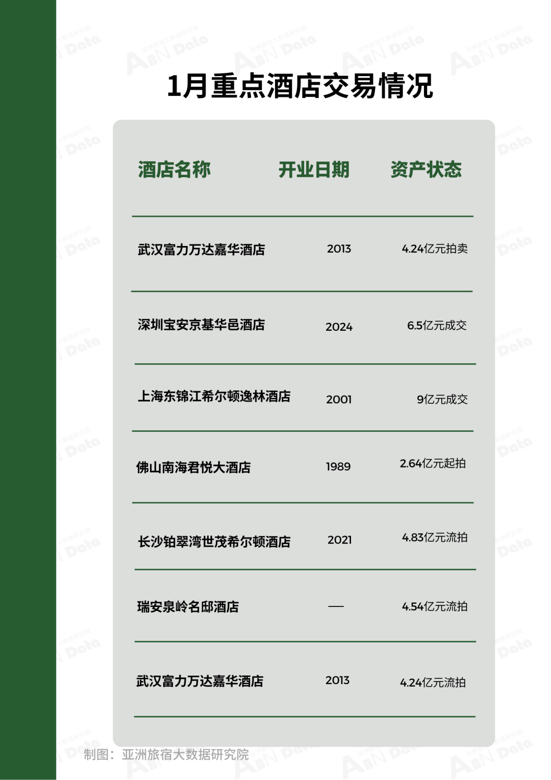 1月,ABN指数监测名录统计共有79家酒店资产处于出售、拍卖及流拍阶段,环比上月仍处于增长态势,拍卖价格在亿元以上酒店有28家,本月有10家酒店成交,8家均为亿元以下酒店。重点酒店拍卖项目有:武汉富力万达嘉华酒店将被拍卖,起拍价约4.24亿元。酒店于2013年开业,该公司的最终实际持有人为富力地产的间接全资附属公司兆晞有限公司。深圳宝安京基华邑酒店易主,收购方为石油能源领域供应链企业控股的广东承希科汇投资控股有限公司,收购金额为6.5亿。上海东锦江希尔顿逸林酒店以9亿元价格被出售,购买方为招商信诺人寿与利安人寿组成的上海瑾东阁私募投资基金。该酒店前身为东锦江索菲特大酒店,2012年更名为现名。佛山老牌酒店南海君悦大酒店所在的土地使用权及相关建筑登上法拍平台,起拍价约2.64亿元,相比第一次拍卖降价约660万。此外,本月还有4.83亿元流拍的长沙铂翠湾世茂希尔顿酒店,4.45亿元流拍的瑞安泉岭名邸酒店项目、4.24亿元流拍的武汉富力万达嘉华酒店等多家亿元项目流拍。