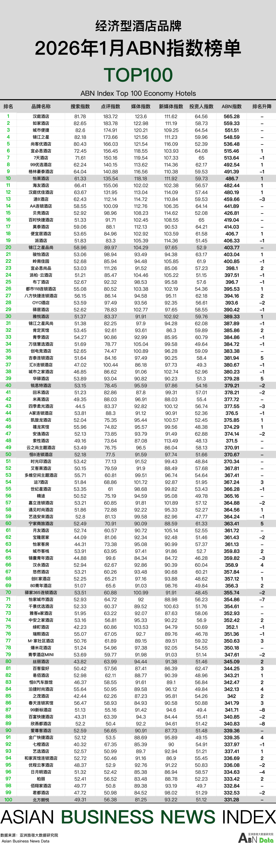 经济型酒店100强榜单