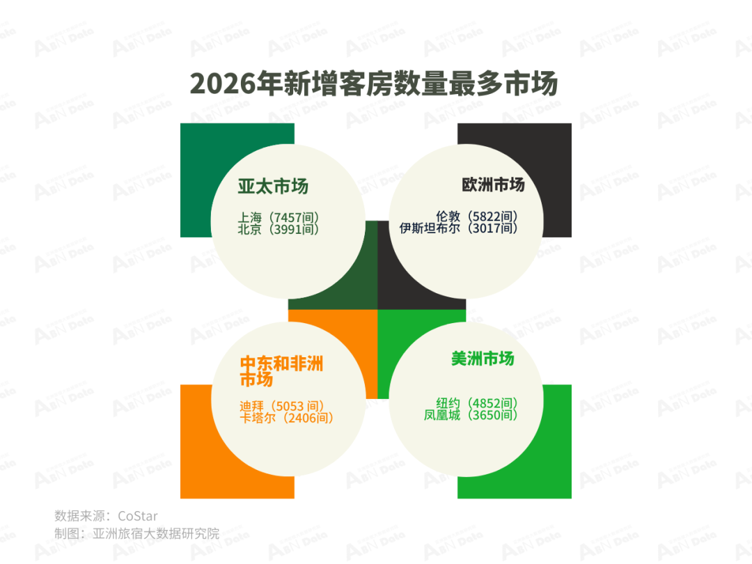 根据CoStar的数据,预计在2026年全球主要酒店市场中,上海、伦敦和迪拜将开设最多的酒店客房。欧洲市场中,预计新增客房数量最多的城市包括伦敦(5822间)和伊斯坦布尔(3017间)。亚太市场中,预计新增客房数量最多的市场包括上海(7457间)和北京(3991间)。中东和非洲市场中,预计新增客房数量最多的市场包括迪拜(5053 间)和卡塔尔(2406间)。美洲市场中,预计新增客房数量最多的城市是美国的纽约市(4852间)和凤凰城(3650间)。
