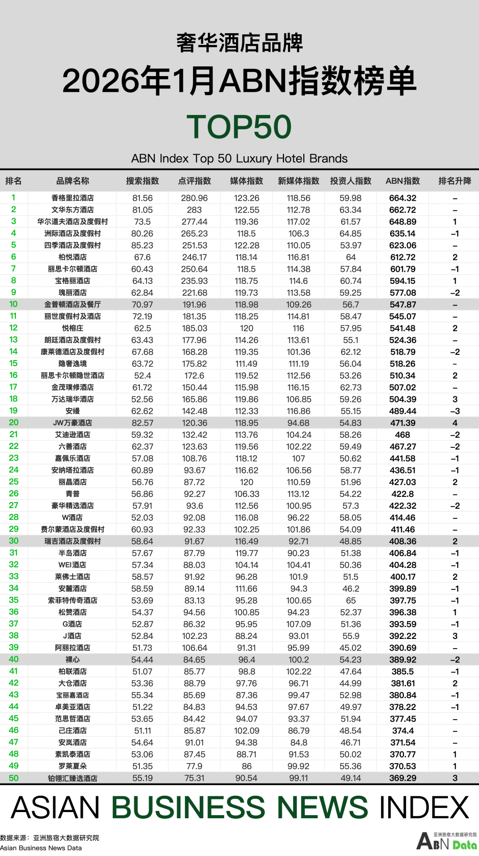 综述:2026年1月,奢华酒店的搜索和新媒体指数小幅下跌,点评指数有所回暖,五个指数监测综合平均得分达到466.99。