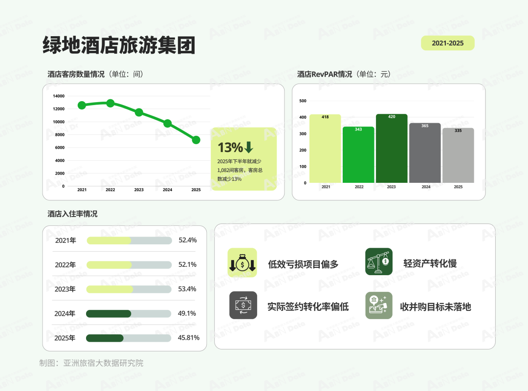 相比之下,本月绿地虽然迎来了浙江宁波湾铂骊酒店开业,但新公布的2025年业绩数据显示,酒店业务仍在承压。2025年绿地酒店年营收约8.77亿元,平均入住率仅45.81%,单房日均收入335元。下半年,公司主动减少约13%的客房数量至6094间,相较于2021年的12554间已是大规模缩减。绿地酒店旅游集团也在2025年三季度工作会议上承认,目前低效亏损项目偏多、轻资产转化慢、收并购目标未落地。