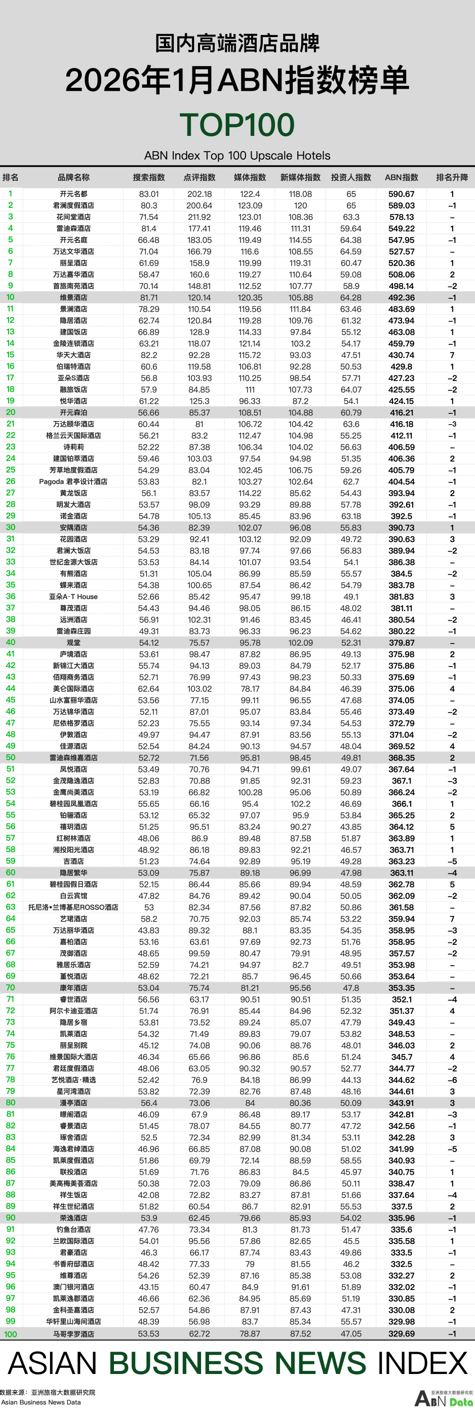 综述:2026年1月,国内高端酒店的搜索指数、媒体指数和新媒体指数保持高位,五个指数监测综合平均得分达到了388.55。