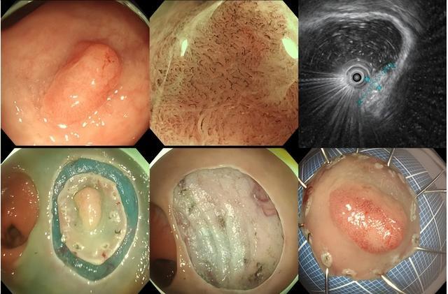 进一步的精查肠镜显示,息肉腺瘤的微血管明显增粗、排列紊乱,部分腺管结构不清,符合直肠早癌表现。经过术前评估,科室为患者实施了肠道黏膜下剥离术(ESD)。
