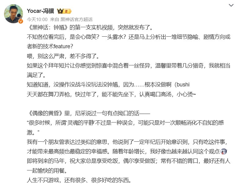 针对这支短片,游戏科学CEO冯骥也专门发声,他表示,短片意在打造“惊喜中藏怪异,温馨里带猎奇”的节日感。而且,短片里的光影贴图、汤汁飞溅的动态物理效果,还有破瓦灶台、旧式厨具这些民俗场景细节,每一处都很精细。咱就是说,官方这波是提前拜早年,顺便凡尔赛一下画面水准是吧?