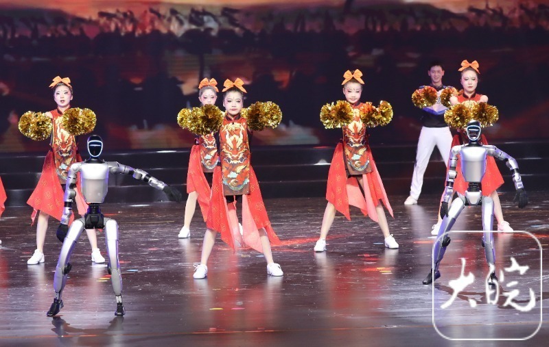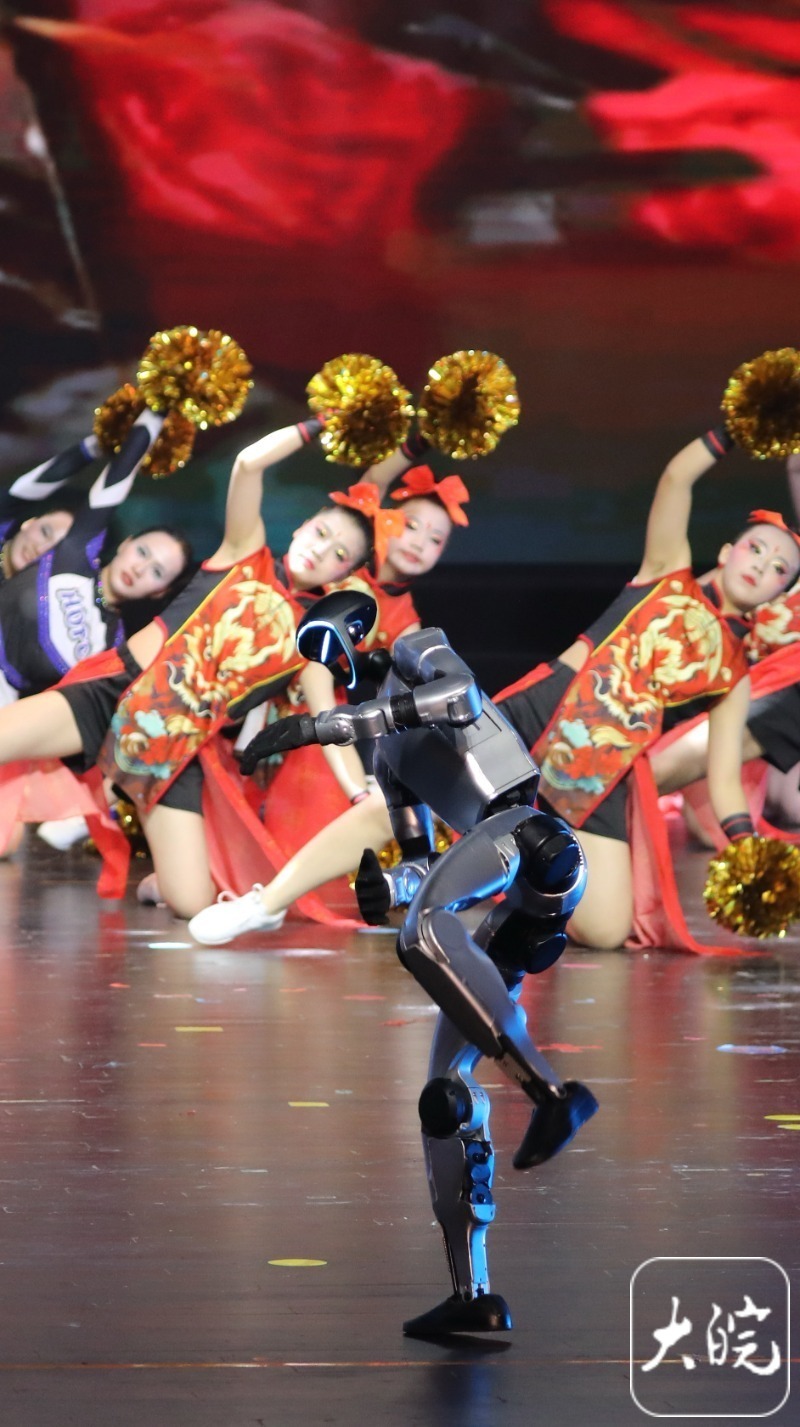 当晚最亮眼的惊喜,当属两台我国自主研发、全球领先的人形智能机器人登台。在淮南一中老师王婷婷编导的《你好,新朋友》节目中,机器人与孩子们携手共舞动感啦啦操,传统韵律与现代科技同频共振,实现传统与现代的温暖拥抱,成为全场焦点。