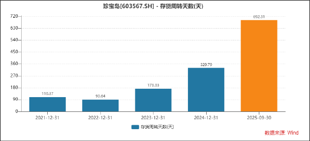 其次是存货激增,资产周转陷入僵滞。 公司存货规模从2023年三季度的10.05亿元增至2025年三季度的15.21亿元,同比增长超50%。存货的异常增长,反映出产品销售严重受阻,库存积压问题突出。