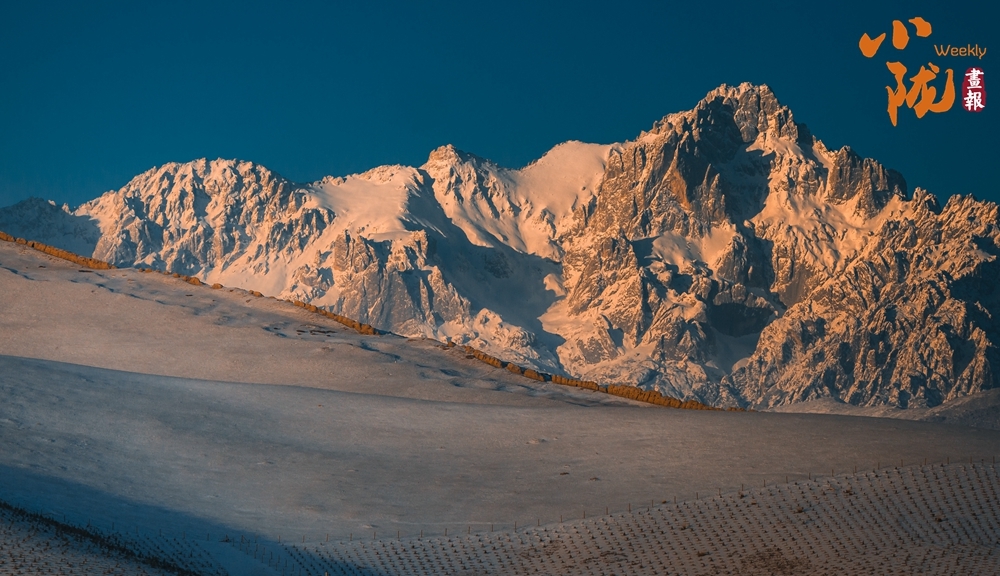 霞光沿着陡峭的山体徐徐蔓延,把寒光凛凛的积雪晕染成温厚的琥珀色泽。天穹是沉静的湛蓝,雪山则如一件精心锻造的鎏金艺术品悬于其间——山腰以下浸入苍茫暮色,峰巅之上仍燃烧着最后的辉煌。