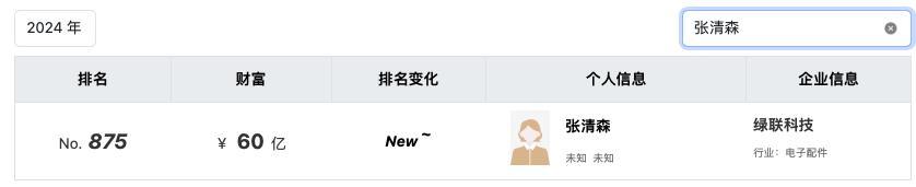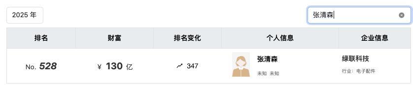 张清森也一跃成为福建莆田的知名富豪。胡润百富网显示,2024年张清森以60亿元的财富登上胡润百富榜,排名875,2025年张清森财富翻倍至130亿元,排名跃升至528。