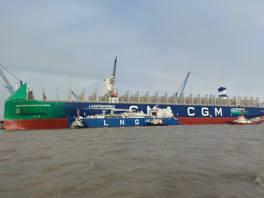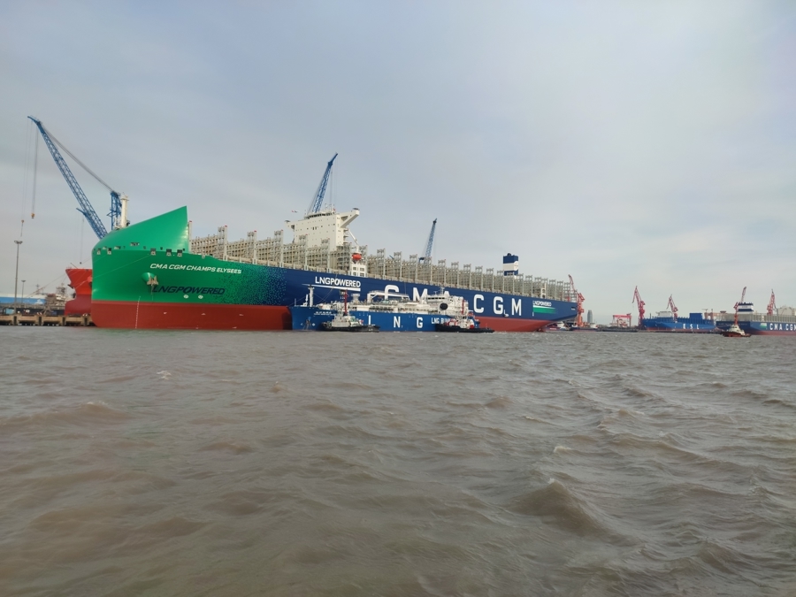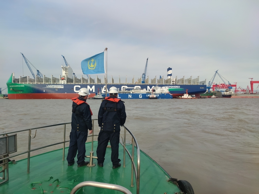 本次加注对象为刚完成坞修的大型集装箱船“达飞香榭丽舍”轮。作业期间恰逢春运水上交通高峰期,叠加岁末船厂生产繁忙、近期寒潮大风天气频发,水域环境复杂、安全管控难度显著提升。面对多重考验,崇明海事局在多次成功实践、“1+3+N”模式已成熟稳定的基础上,进一步优化全流程保障方案,让成熟体系释放更强效能。