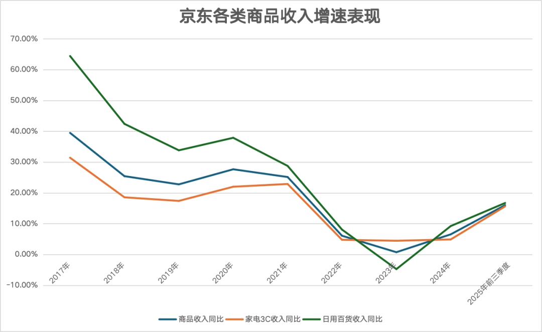 然而亮眼增速之下,危机暗伏。作为京东“起家之本”的3C家电业务,增长已显疲态,数据显示,2022至2024年间,该品类收入年均增长不足5%,甚至在2024年第二季度出现同比下滑。