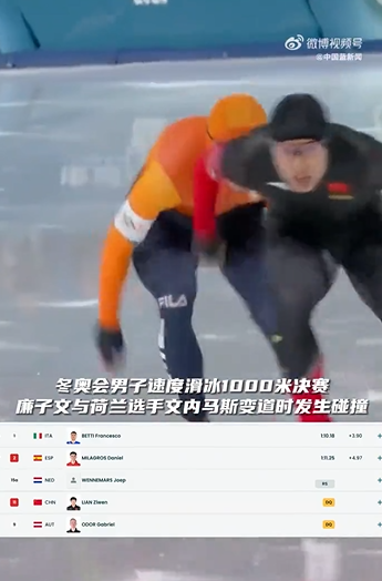 据中国蓝新闻,2月12日,米兰冬奥会速度滑冰男子1000米,中国选手廉子文第11组出发,同组出发的是荷兰选手文内马斯,廉子文最终滑出1分08秒74,但是因为冰刀与对手发生了碰撞,而廉子文处于内道,速滑规则,换道时内道要让外道,所以廉子文成绩被取消,文内马斯被判获得重滑机会。