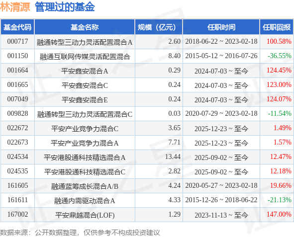林清源先生:中国国籍,美国宾夕法尼亚大学系统工程硕士、上海交通大学信息工程学士,具有基金从业资格。2011年7月加入融通基金管理有限公司,历任互联网传媒行业研究员、家电行业研究员、计算机行业研究员、融通互联网传媒灵活配置混合型证券投资基金基金经理(2015年5月12日至2016年7月26日)、融通内需驱动混合型证券投资基金基金经理(2015年12月26日至2018年6月22日),现任融通转型三动力灵活配置混合型证券投资基金基金经理(2018年6月22日至2023年2月18日)。融通蓝筹成长证券投资基金基金经理(2020年5月27日至2023年2月18日)。2023年2月加入平安基金管理有限公司,2023年11月13日起担任平安鼎越灵活配置混合型证券投资基金基金经理。2024年7月3日起担任平安鑫安混合型证券投资基金基金经理。2025年9月2日担任平安港股通科技精选混合型证券投资基金基金经理。