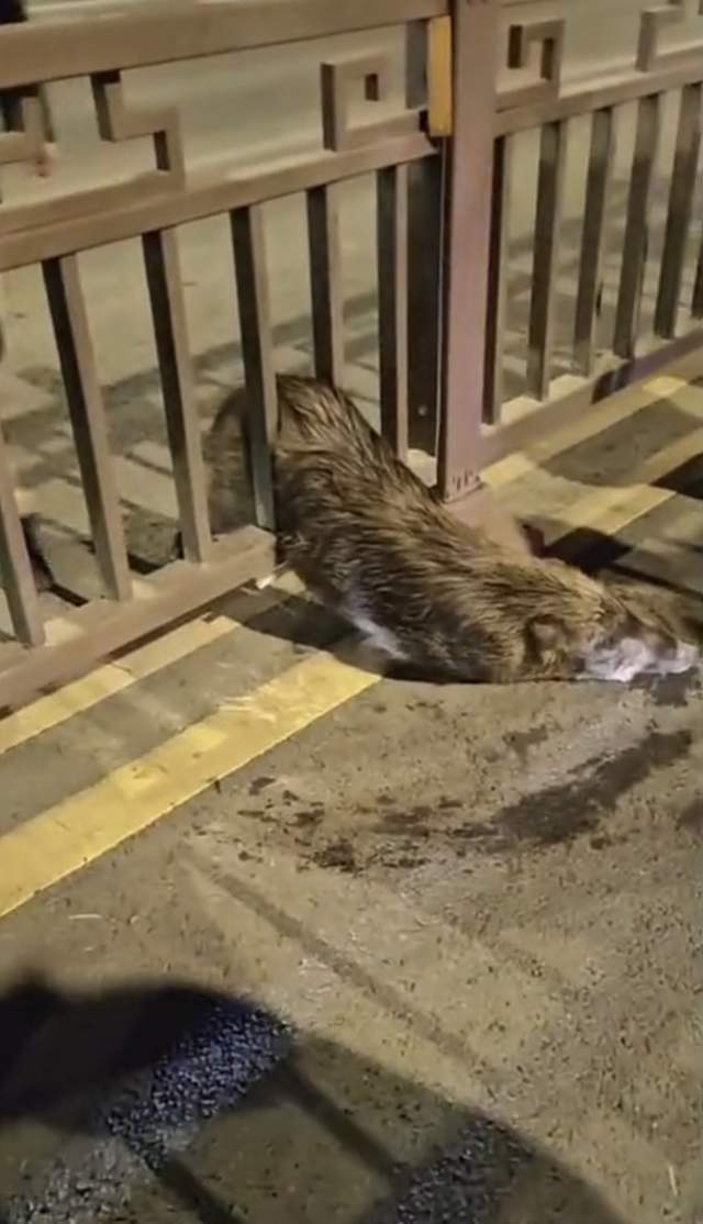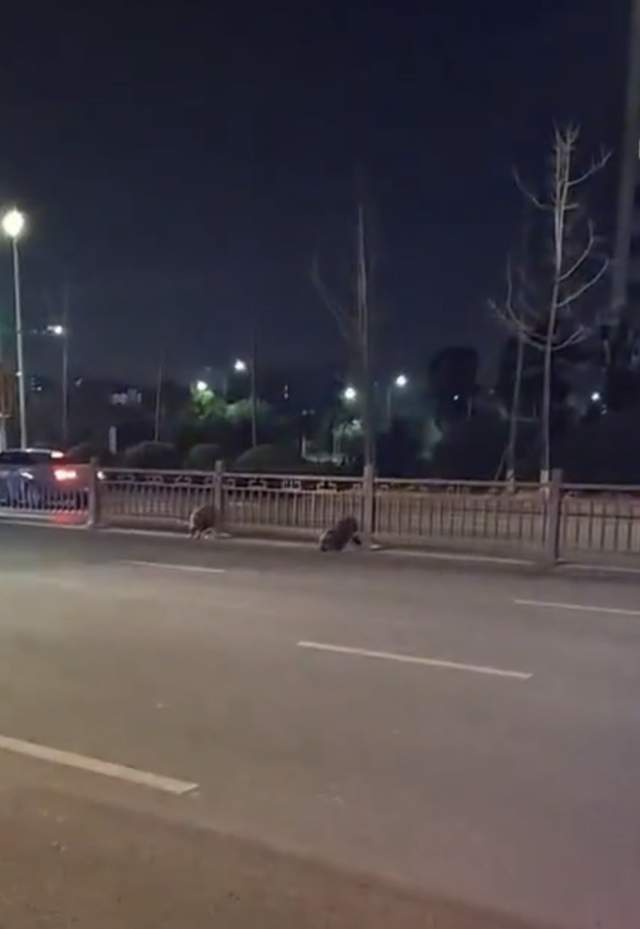 2月11日晚,网友发布视频称,江苏扬州市邗江区,有两只野猪在街上转悠,后来卡在护栏上。