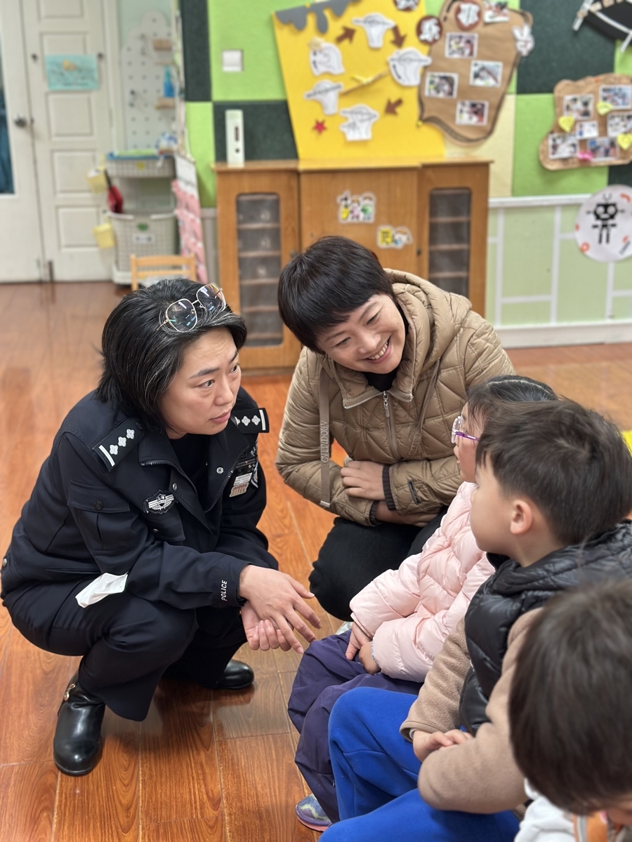普陀区美墅幼儿园里,园长和民警一起与小朋友互动