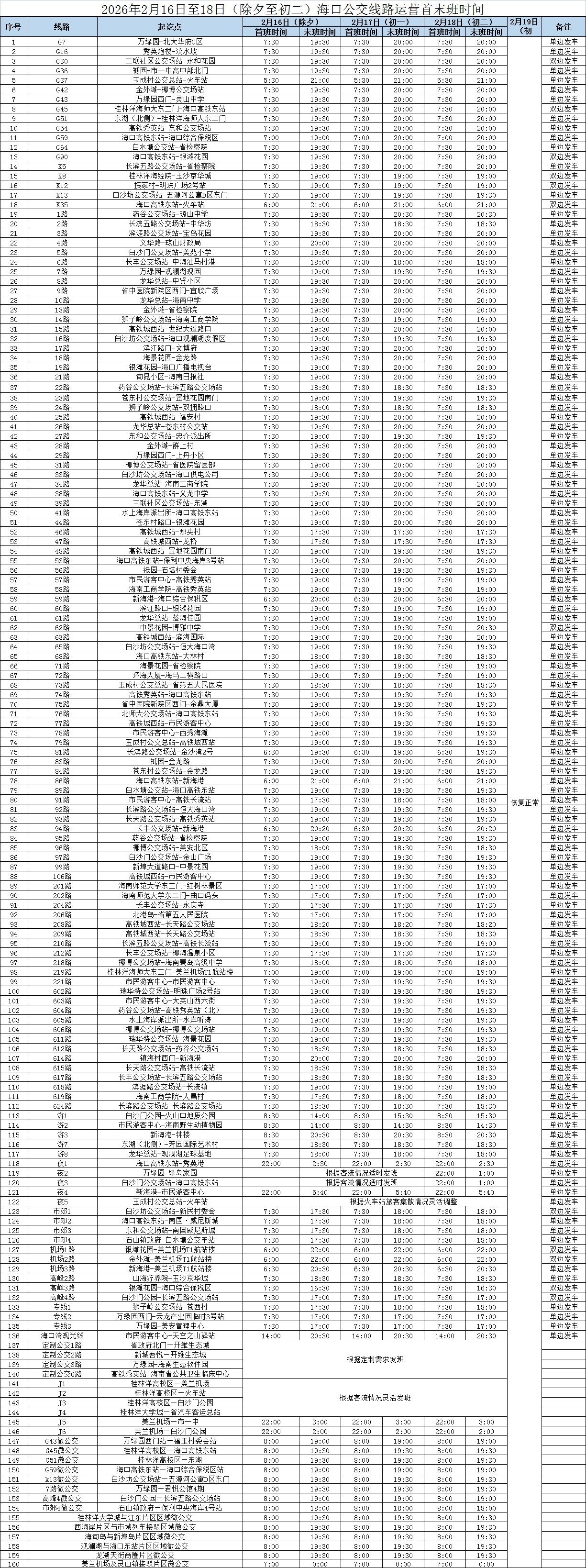 (3)2月19日(大年初三)起,所有公交线路恢复正常营运;J1、J2、J3、J4四条桂林洋高校区假日专线春运期间开通(2月2日至3月13日),根据客流情况灵活调度发班;J5、J6两条假日机场夜线春运期间开通(2月2日至3月13日),首班时间22:00,末班时间和发班间隔根据美兰机场旅客集散情况灵活调整;海口高铁东站夜1路、夜3路及新海港夜4路将首班时间提前至22:00发班;火车站夜5路发班根据火车站旅客集散情况灵活调整。