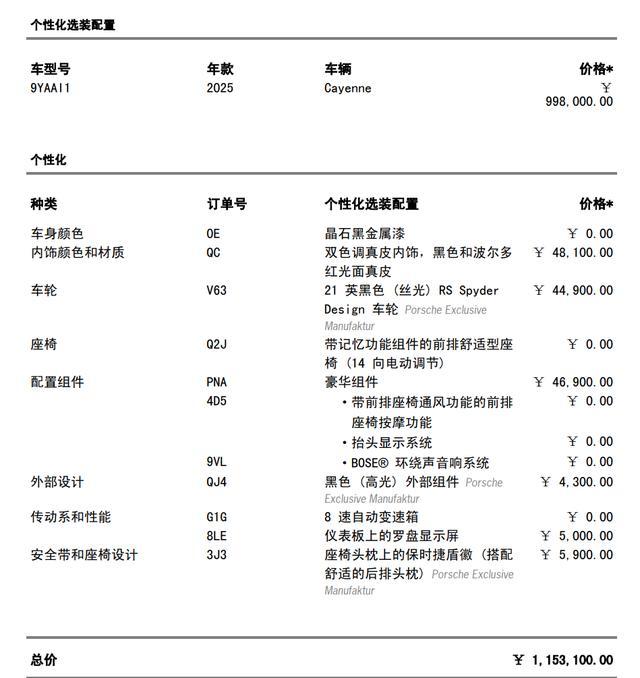 小克购买的保时捷卡宴配置单。(图/受访者供图)