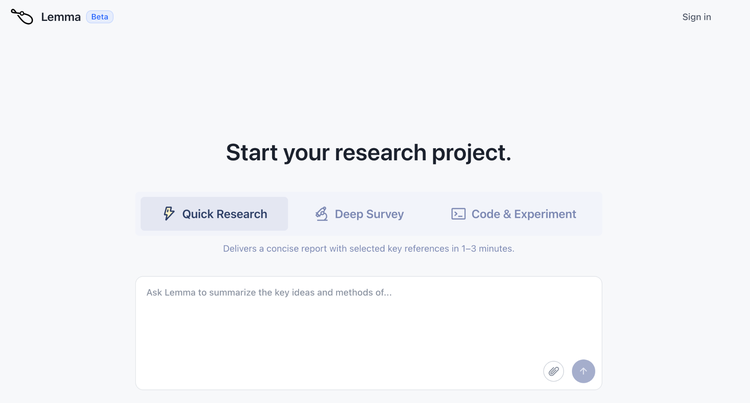 在FARS之前,Analemma已经上线了一个名为Lemma的产品(lemma.analemma.ai),提供快速文献调研、深度调研报告和代码实验三项功能。孙天祥告诉硅星人,Lemma是辅助驾驶,定位是生产力工具;FARS是自动驾驶,定位是基础设施。