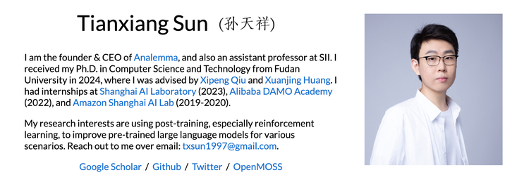 MOSS走红时,孙天祥还在读博。据了解,当时国内几位知名的大模型创业者都曾邀请他加入,但彼时博士还没毕业。2024年毕业后,VC也接踵而至。他最终选择了自己创业:2025年3月创办Analemma(日行迹智能),同期加入上海创智学院担任助理教授,走了一条学术和创业并行的路。