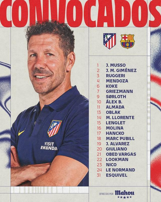 马德里竞技官方公布了国王杯半决赛首回合主场对阵巴萨的比赛大名单,格列兹曼领衔,瑟洛特回归。