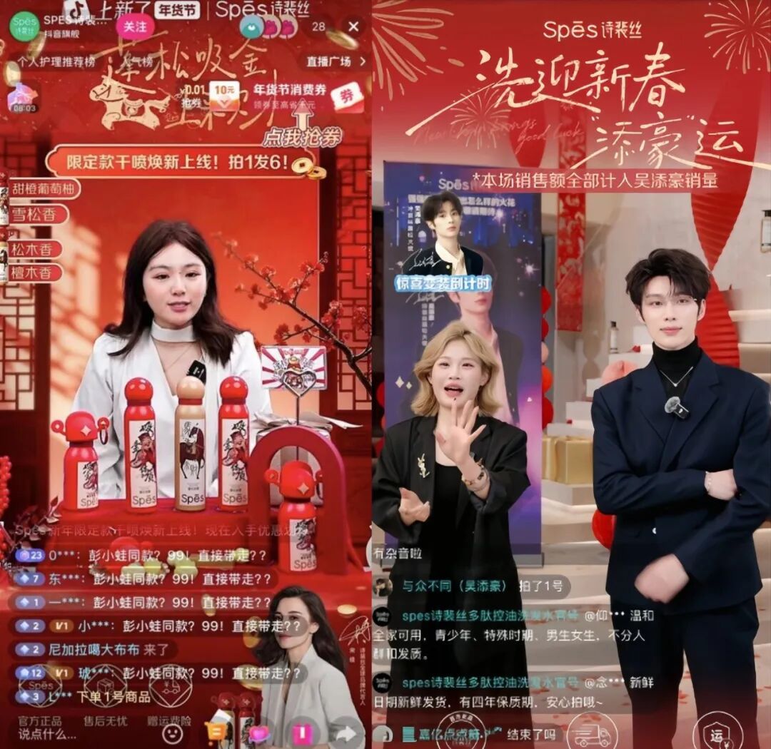 比如日化TOP品牌Spēs诗裴丝,在年货节的产品主角是一款免洗空气感蓬松喷雾。跟普通产品不同,它采用了马年限定包装、搭载了“马上有钱”的美好寓意,让产品成为一款具有情绪价值与象征意义的潮品。此外配合热门短剧的植入、直播,放大了“拥有好用的产品=好运变富”的积极情绪。