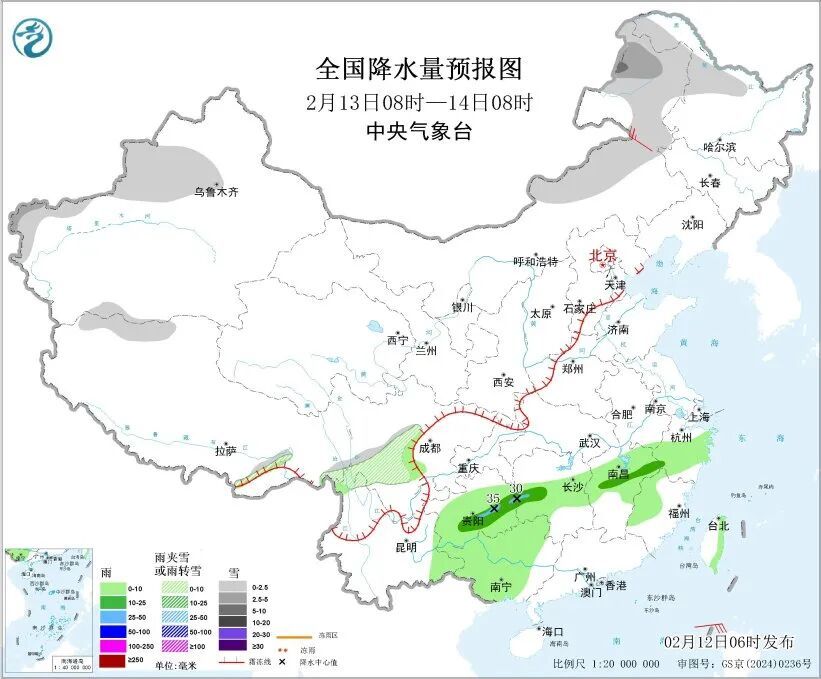 2月13日8时至14日8时,内蒙古东部、黑龙江北部、新疆沿天山地区和伊犁河谷、川西高原南部等地部分地区有小雪或雨夹雪,其中,内蒙古东北部等地部分地区有中到大雪。江南中北部和南部、西南地区东南部、广西中西部等地部分地区有小到中雨,其中,湖南西部、贵州中部等地部分地区有大雨(25~35毫米)。内蒙古东北部部分地区有4~5级风。巴士海峡将有6~7级、阵风8级的偏东风,南海东部和西南部海域将有4~6级、阵风7级的偏东到东北风。
