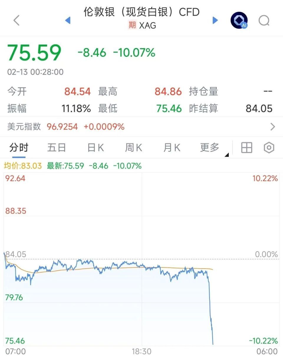 财联社2月13日电 国际贵金属直线跳水,现货黄金跌超3%,报4923美元/盎司。现货白银跌超10%,报75.59美元/盎司。