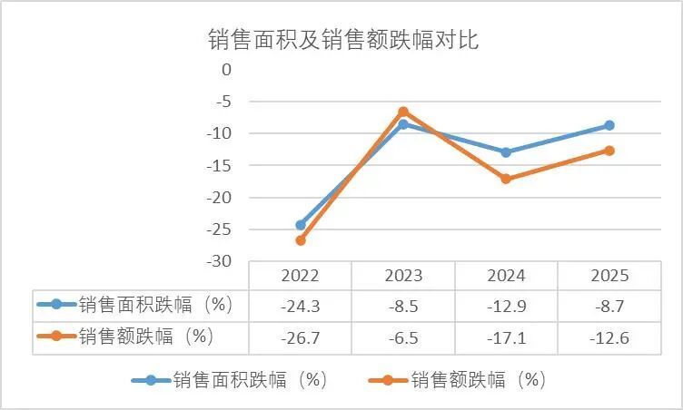 同时,观点新媒体注意到,除2023年之外,2021年至2025年全国新建商品房销售额降幅明显高于销售面积降幅。