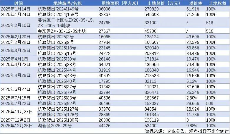 回顾滨江集团2025年在土拍市场表现,观点新媒体注意到,除了12月2日以底价13.61亿元竞得杭州滨江区浦沿单元地块之外,其余所有地块都是溢价成交。