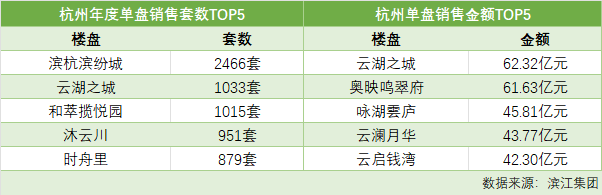 具体到楼盘销售上,市场数据显示,杭州年度单盘销售套数TOP5依次为滨杭滨纷城2466套、云湖之城1033套、和萃揽悦园1015套、沐云川951套、时舟里879套;单盘销售金额TOP5分别为云湖之城、奥映鸣翠府、咏湖雲庐、云澜月华、云启钱湾,成交金额分别为62.32亿元、61.63亿元、45.81亿元、43.77亿元、42.30亿元。